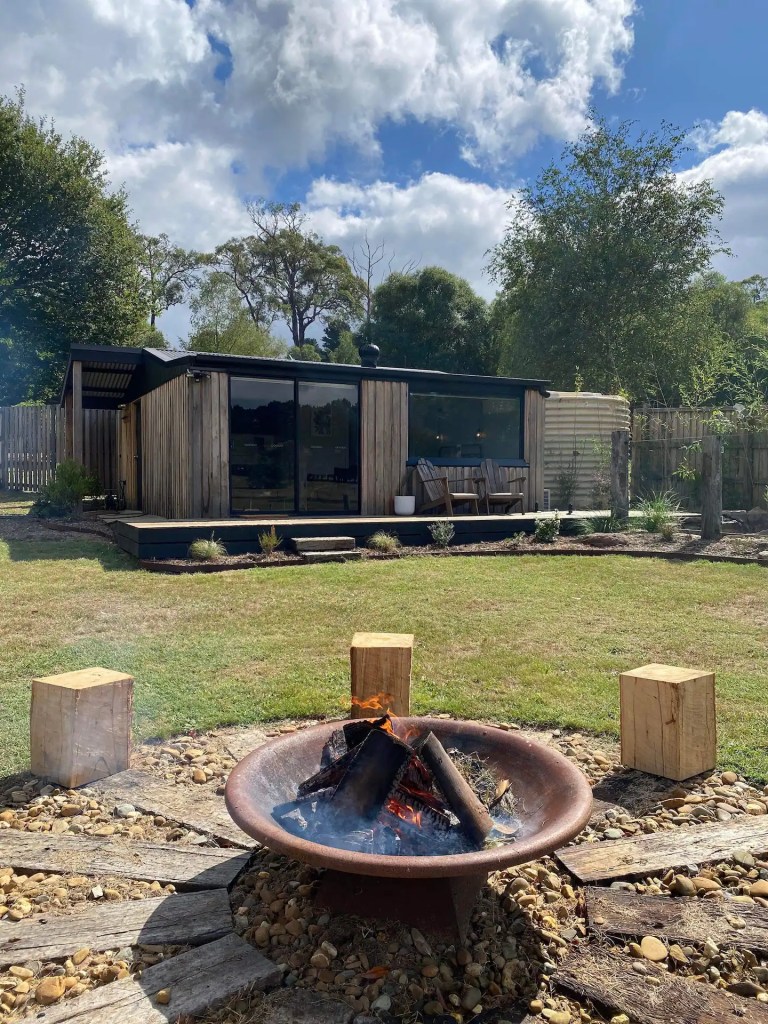 Inside the cabin, you’ll find a studio kitchen equipped with the basic necessities for those happy to cook their own meals such as a cooktop, mini fridge, microwave, toaster etc. I highly advise doing a grocery shop prior to arriving at the cabin, otherwise, you can pop into Kinglake approx. 10 minutes away which has a Foodworks, just be aware that it’s a lot more expensive than doing a shop at Coles or Woolies. If you want to treat yourself to a dinner cooked for you, then I’d recommend ordering takeaway from Songbird Cafe & Larder and enjoying it back at the cabin like we did on the first night – they have a range of options from wood-fired pizzas to burgers, to your stock standard restaurant mains.