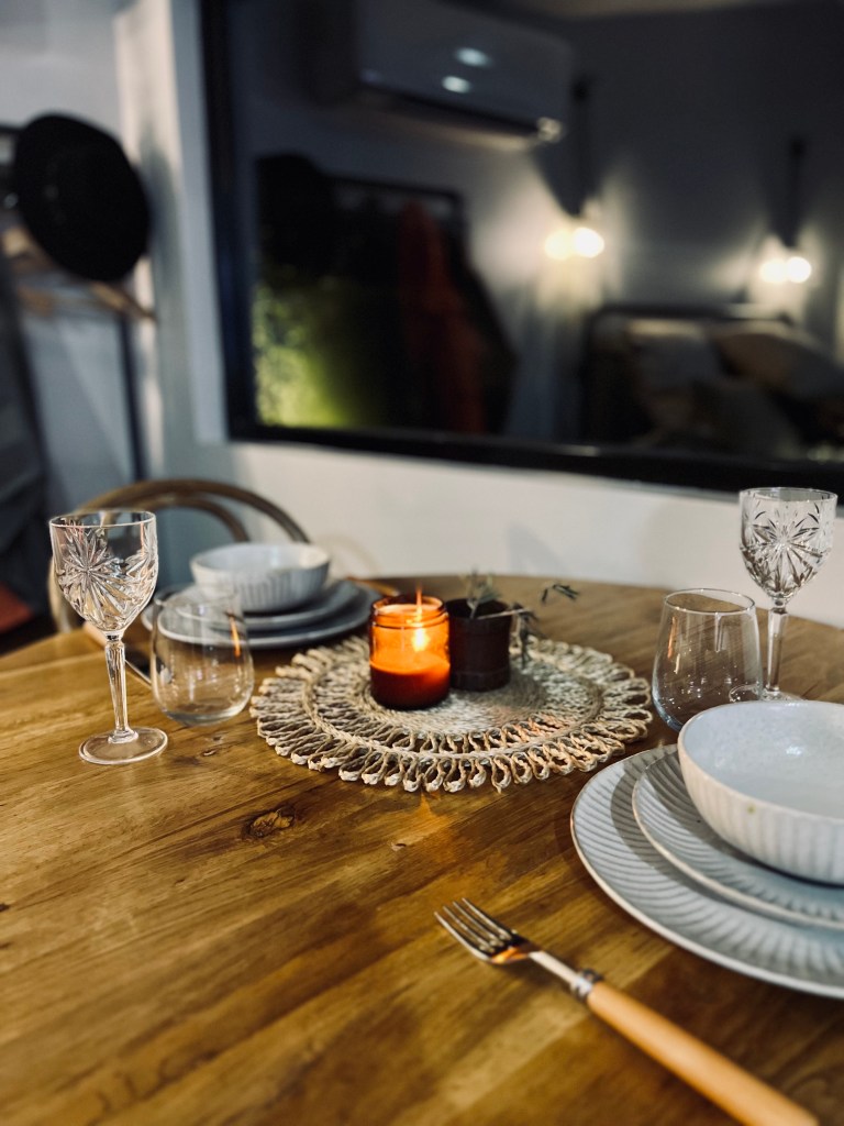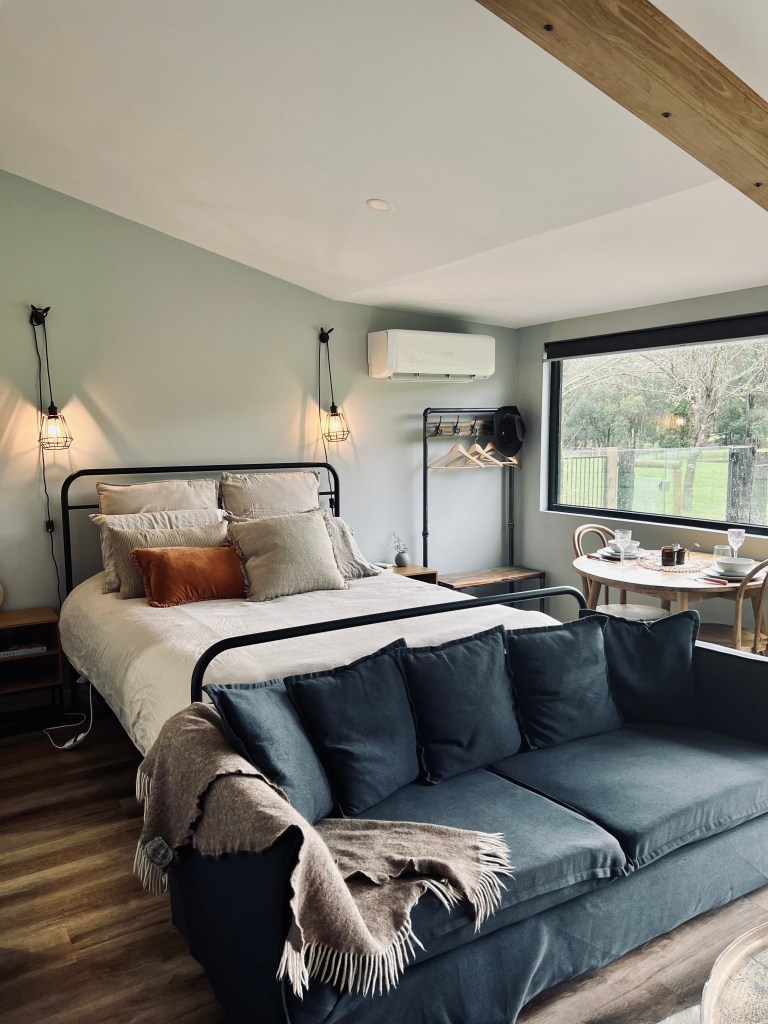 The kitchenette is an open floor plan backing into a little lounge area which consists of a couch, coffee table and incredibly large TV with glass sliding doors with views out to the farmland and dam. The studio space also features a 2-person dining table – which was so lovingly set by the host Louisa – again with views out to the farmland, and of course, a queen bed to rest your weary head.